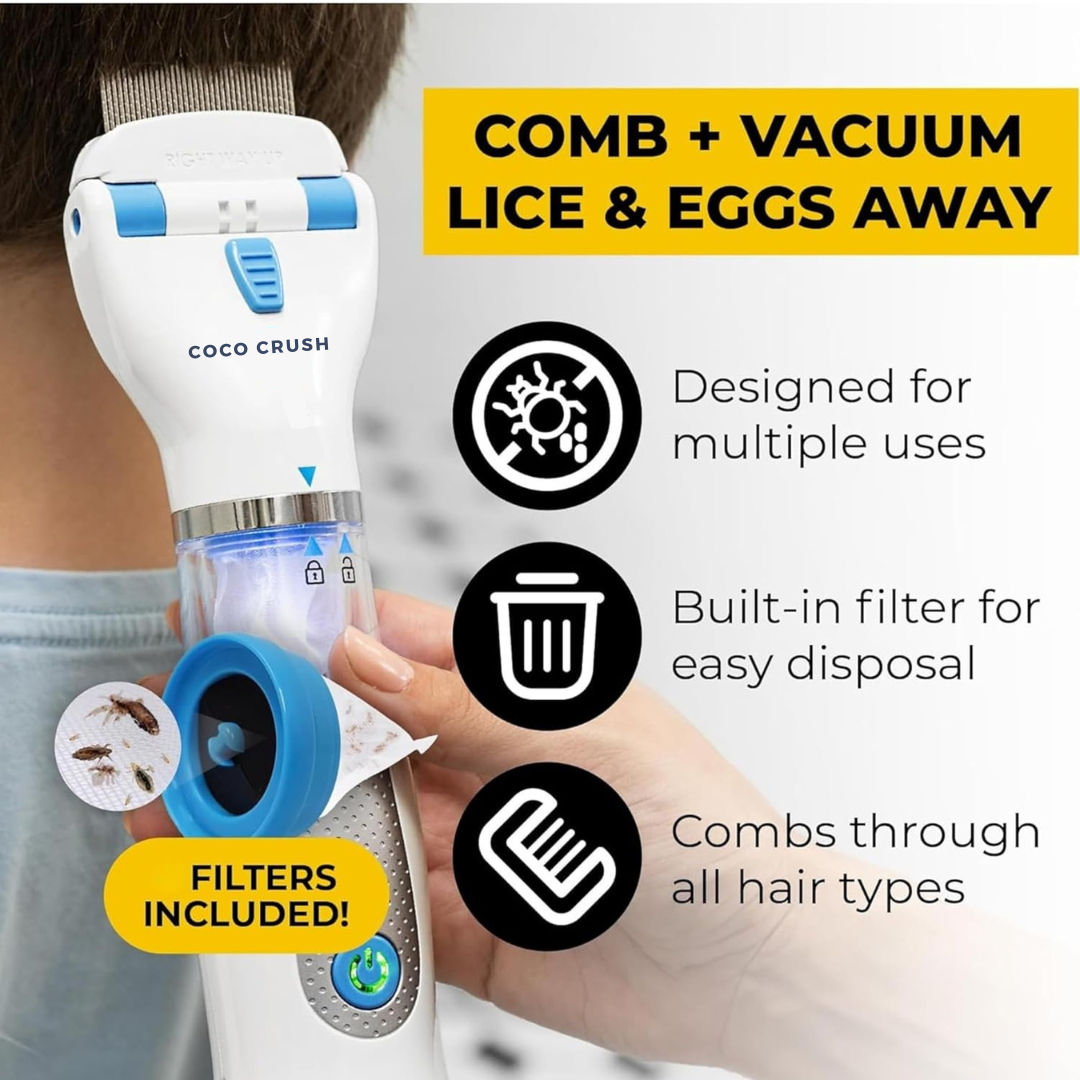 The Coco Crush Electric Lice Comb with Suction is a safe, chemical-free alternative to traditional lice treatments. Instead of harsh shampoos and treatments, it uses vacuum suction technology to physically remove lice and nits from the hair.
